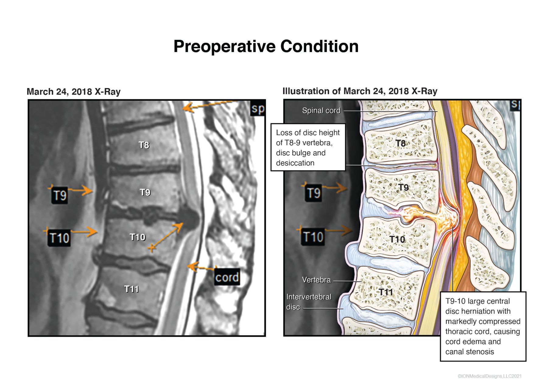 Preoperative condition of a man with a near occlusion of the spinal canal due to a herniated, calcified intervertebral disc.
