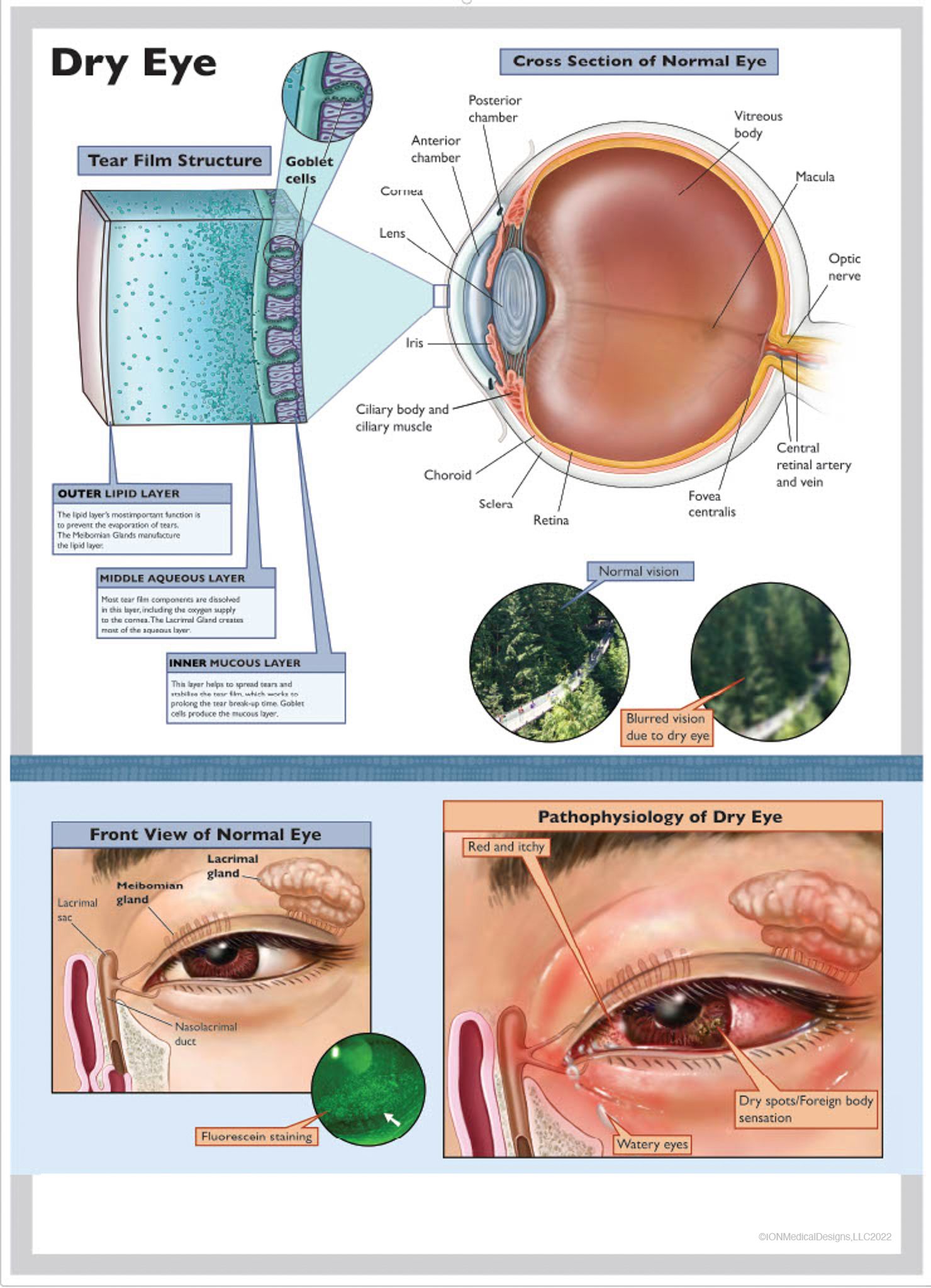 Dry eye patient education poster depicting normal anatomy as well as pathophsyiology.