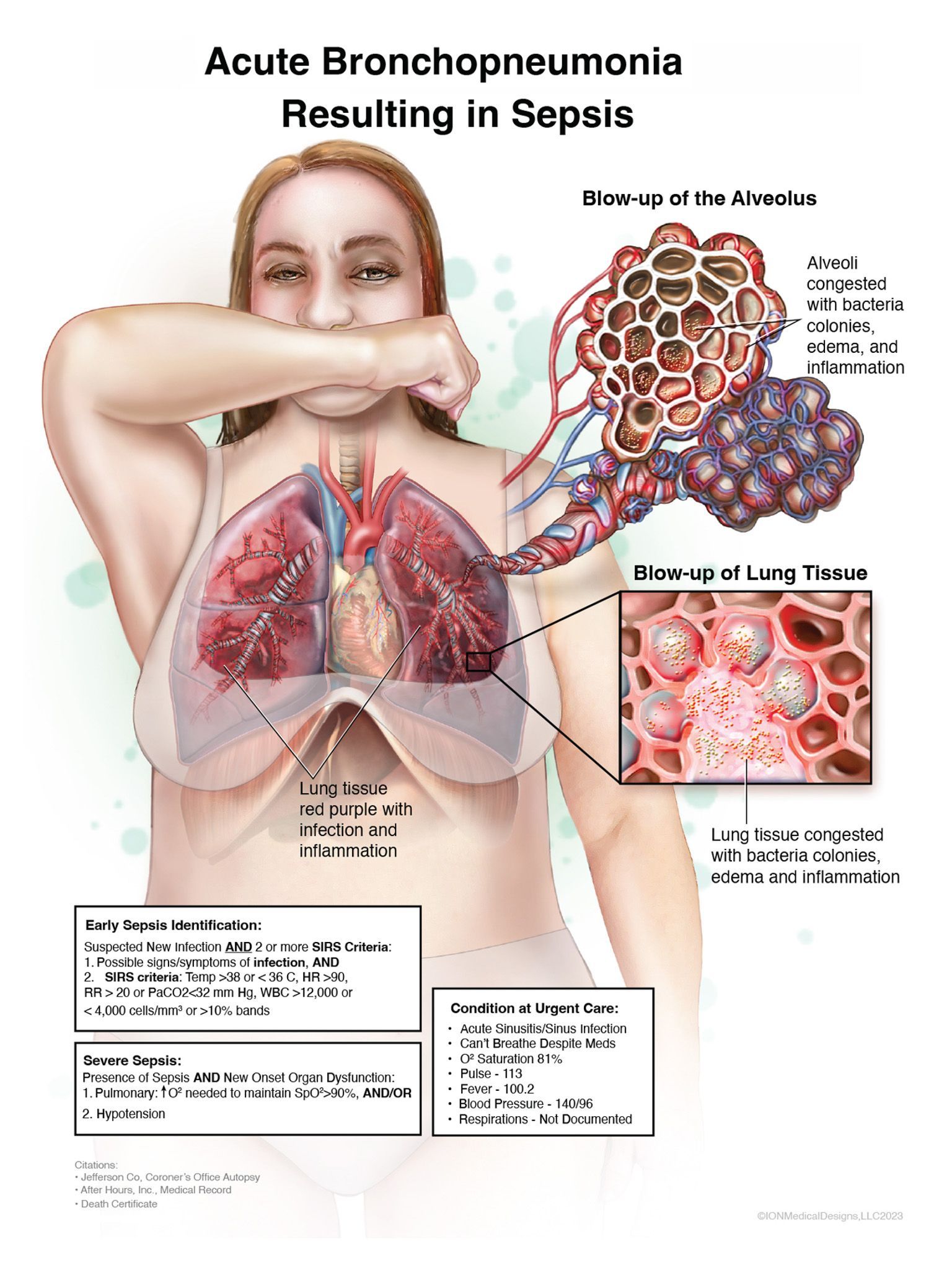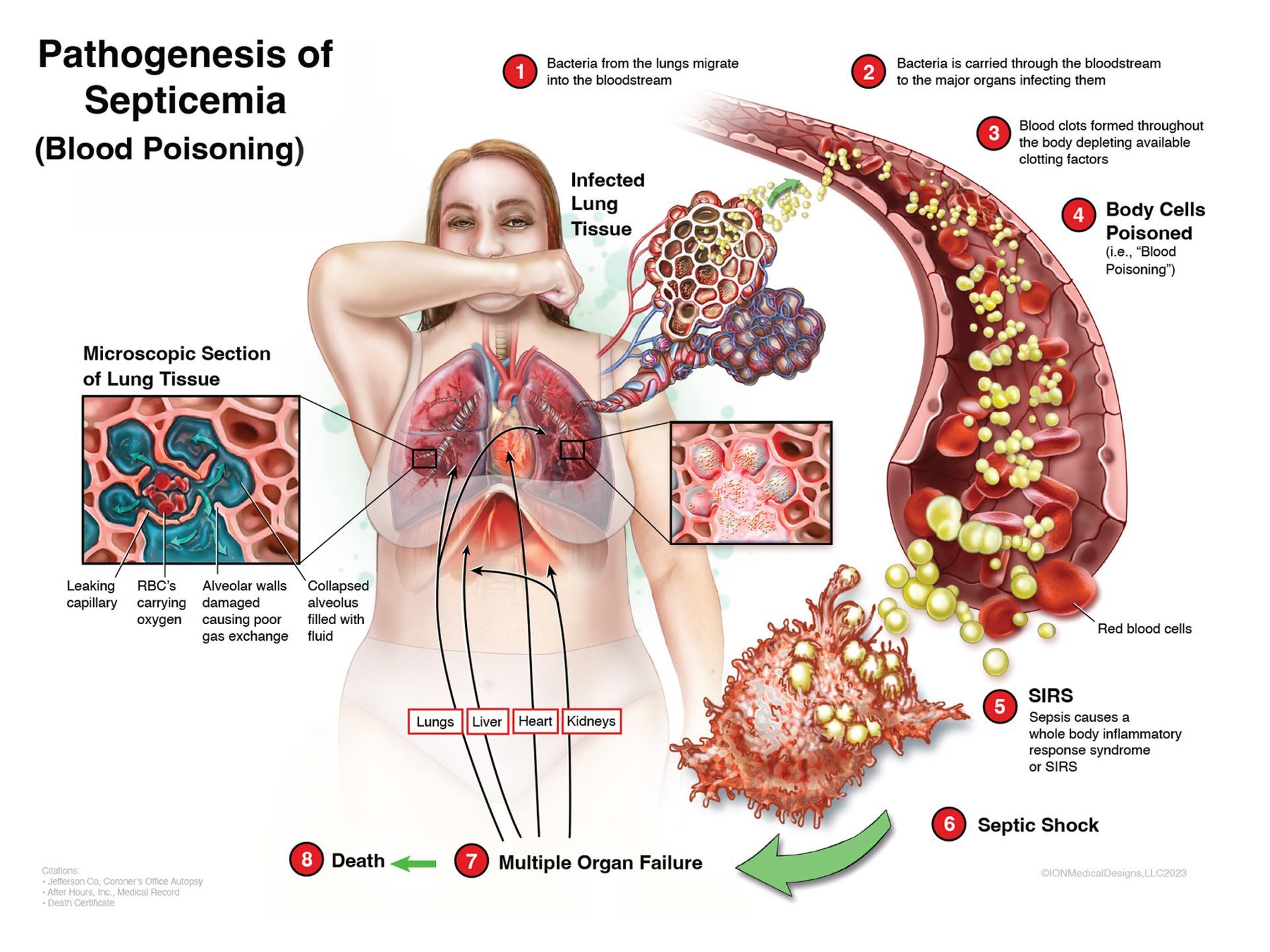 The illustration represents the pathogenesis of septicemia (blood poisoning) starting in the lungs, traveling through the bloodstream, infecting the blood and then is carried to her lungs, liver, heart and kidneys.