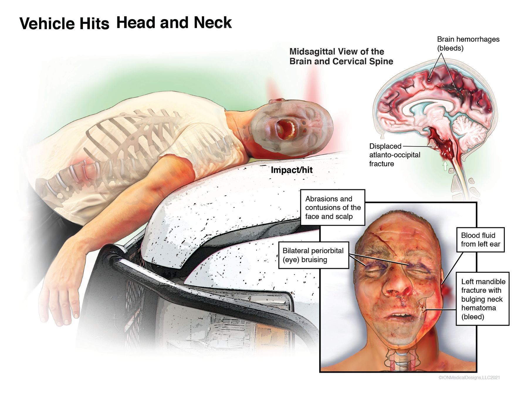 Mechanism of injury board depicting head and neck injuries sustained from a pedestrian versus motor vehicle accident.