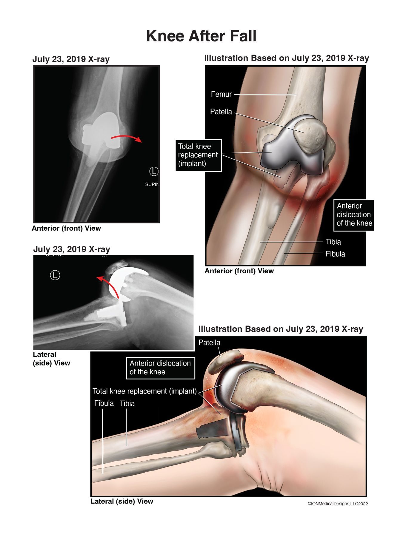 Fall after total knee replacement surgery resulting in a complete dislocation of the knee joint.