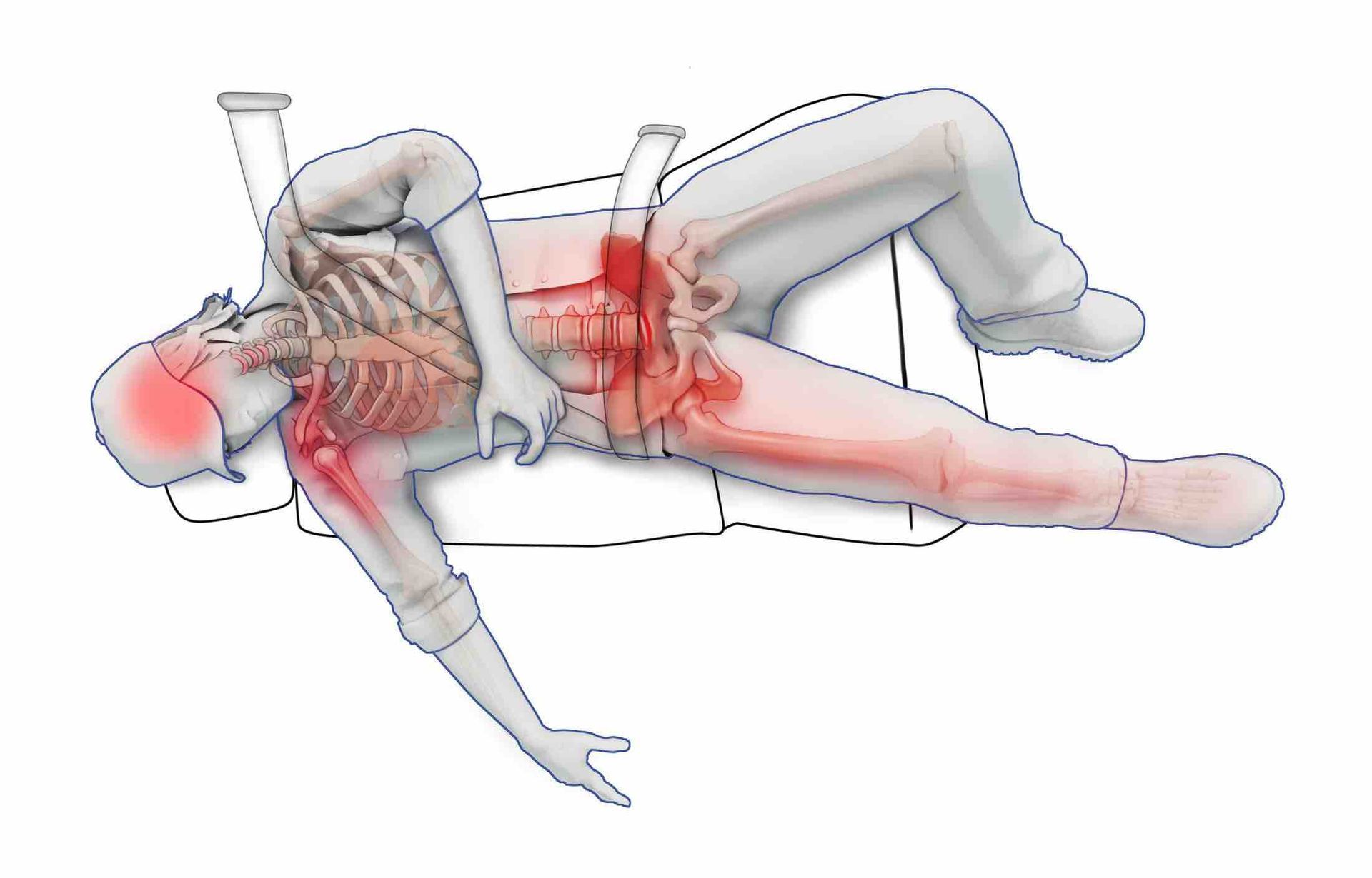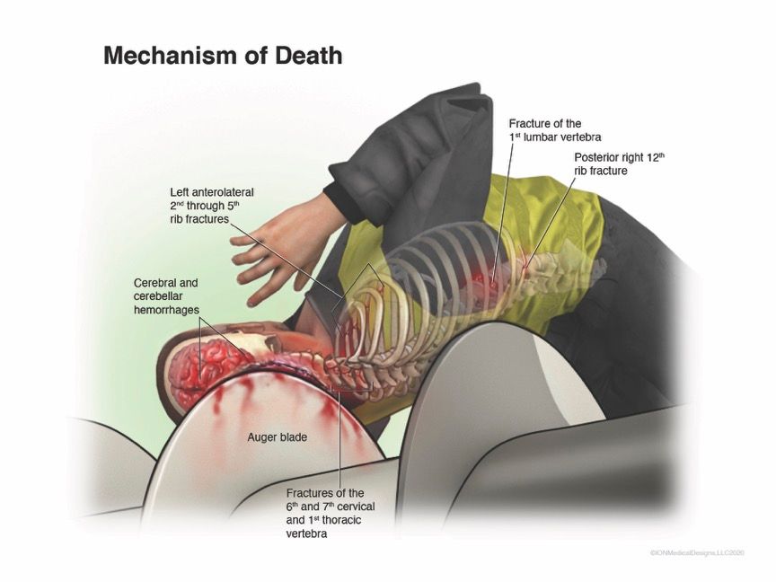 Medical litigation demonstrative in which the client was a victim of a fatal industrial accident. The attorney commissioned a multiple injury board to include all injuries sustained for litigation purposes.