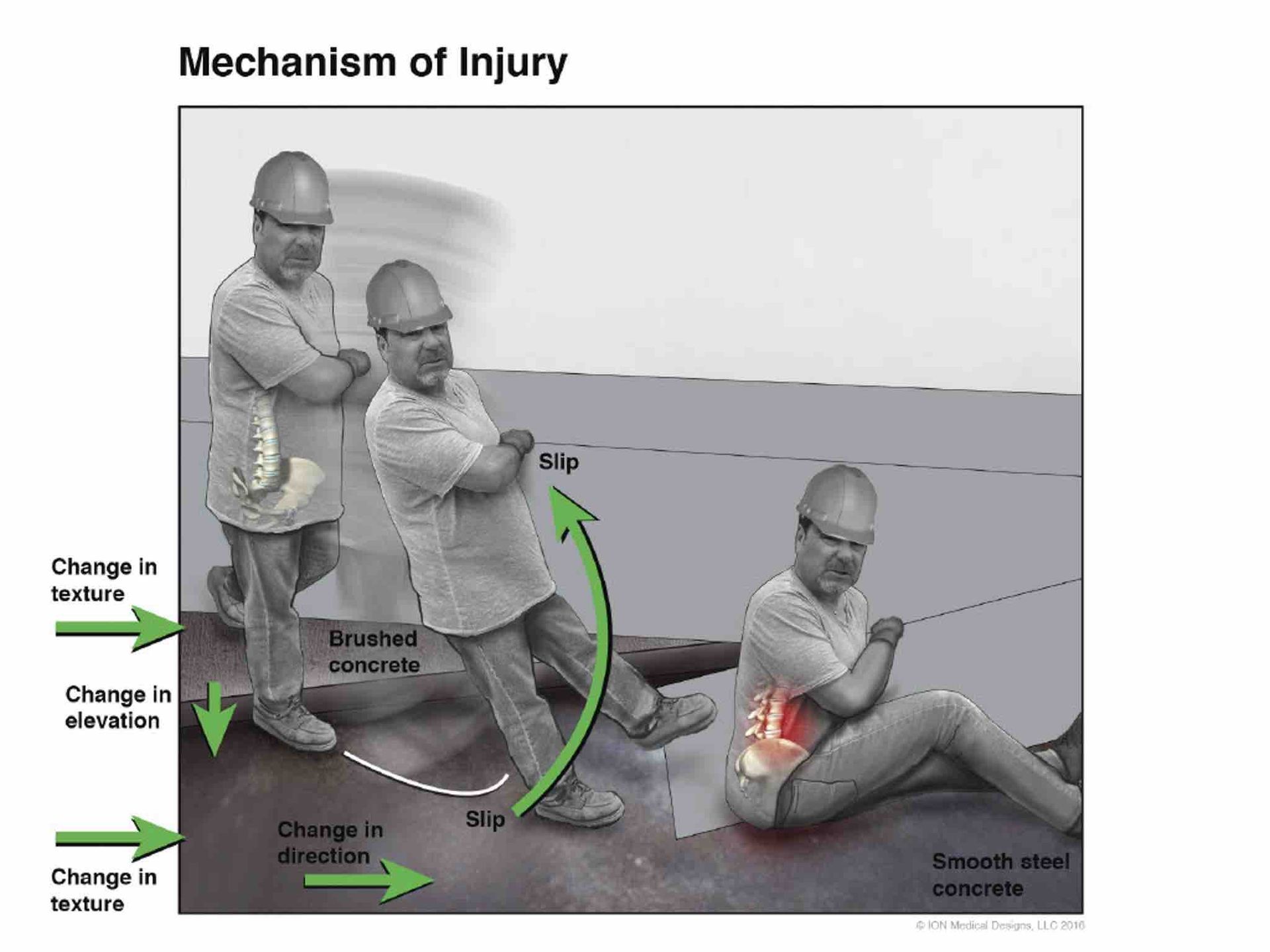 This depicts a slip and fall work accident causing injury to the spine.