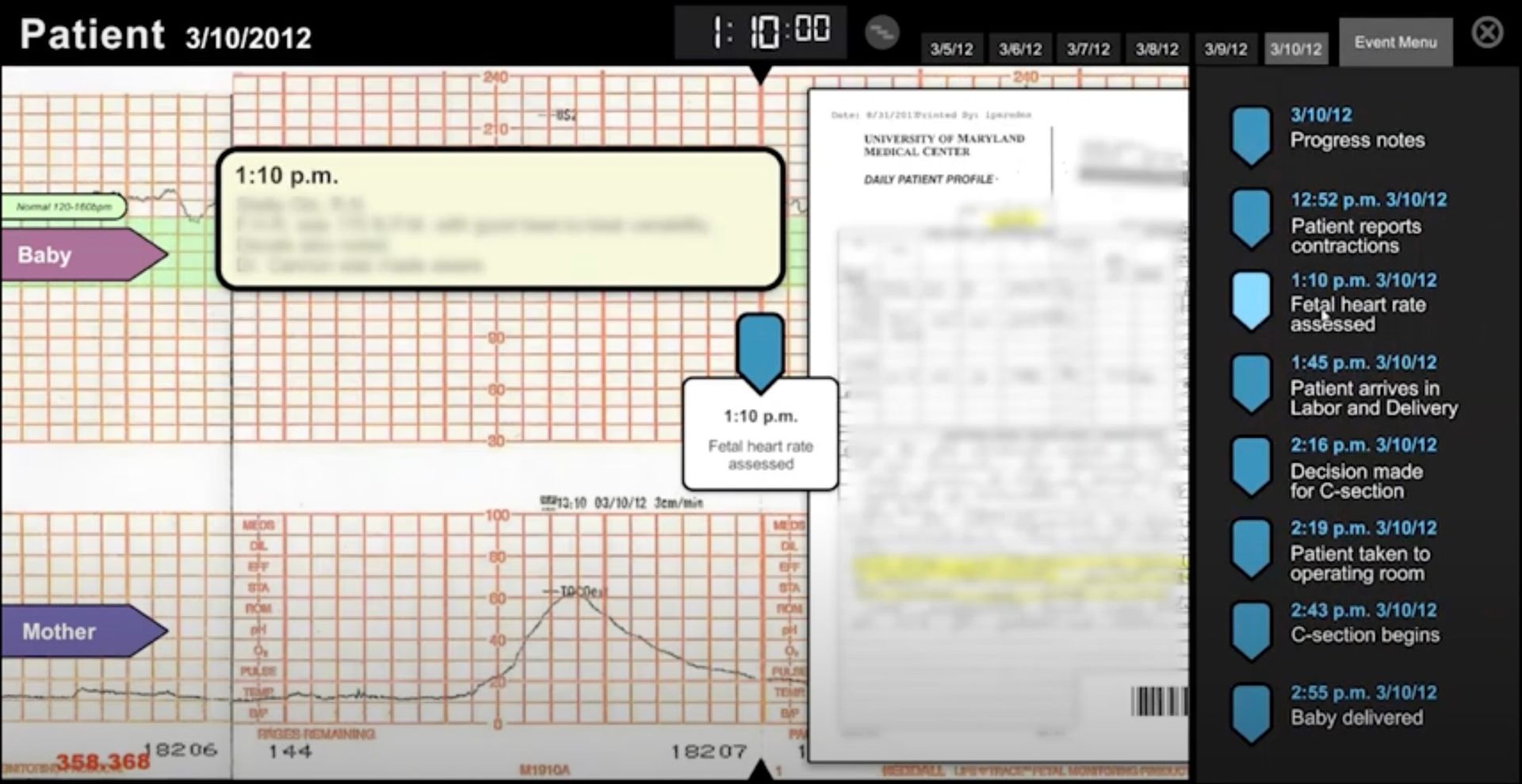 Interactive digital fetal monitor strip. Presentations can have all of the medical records and blowups of specific records related to attorneys strategy.