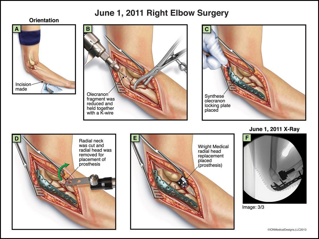 Medical litigation demonstrative for a personal injury case in which the client underwent an ORIF (Open Reduction and Internal Fixation) surgical procedure to repair her olecranon and coronoid elbow fractures she sustained in a biking accident.