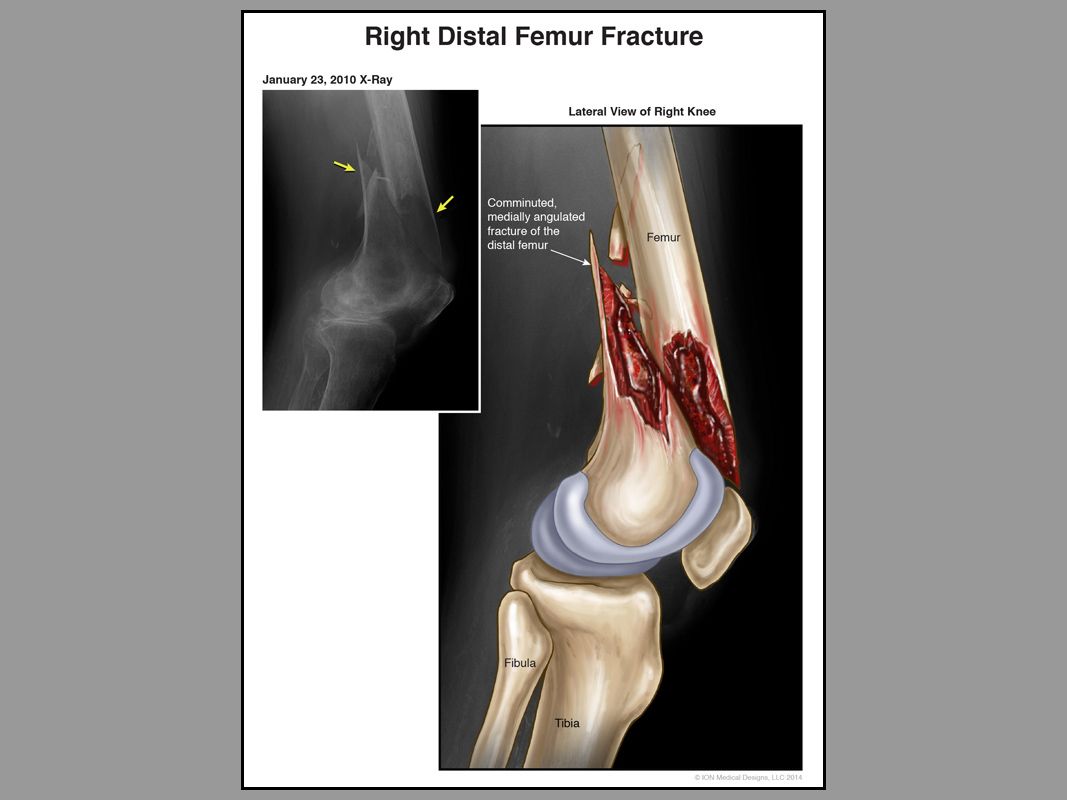 Medical litigation demonstrative depicting a nursing home-related incident where the client sustained a comminuted, medially angulated fracture of the right distal femur.