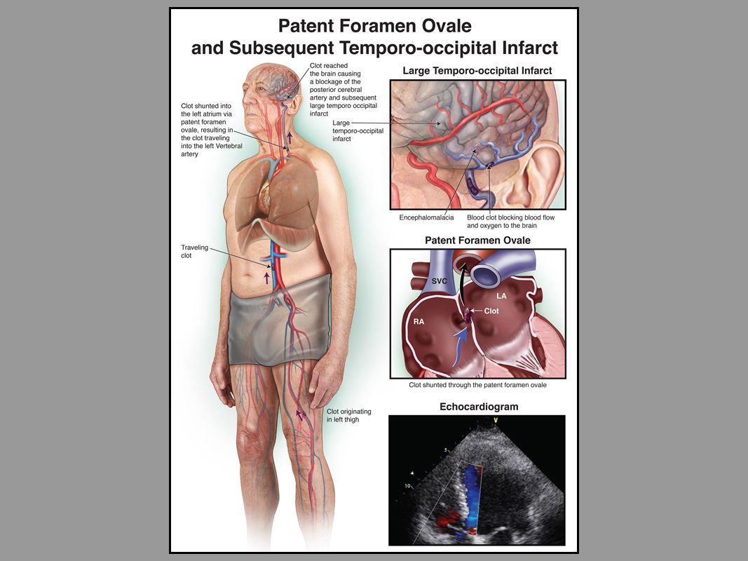 Medical litigation demonstrative was created for a medical malpractice case in which the client suffered a stroke following a double knee replacement surgery. As a result of Patent Foramen Ovale (acongenital defect), an embolus traveled to and blocked his cerebral artery, subsequently causing an infarct in the temporo-occipital region of the brain.