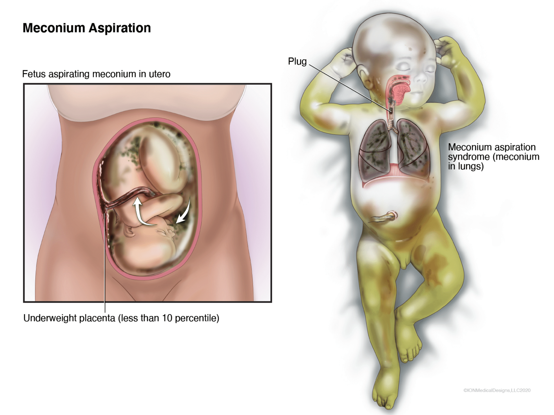 Meconium aspiration syndrome is when the fetus breathes in meconium (first stool) in utero. This baby had a mucus plug as well as meconium in his lungs.