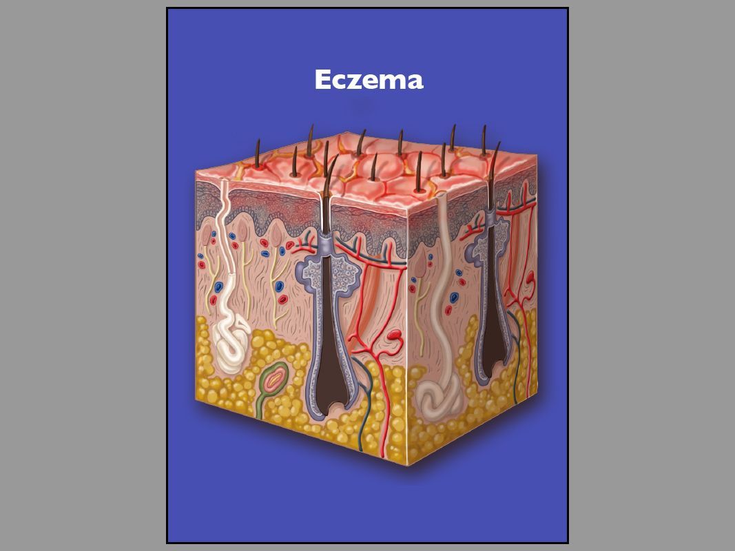 Illustrations to accompany a physical model of skin cube depicting eczema, psoriasis, and dandruff.
