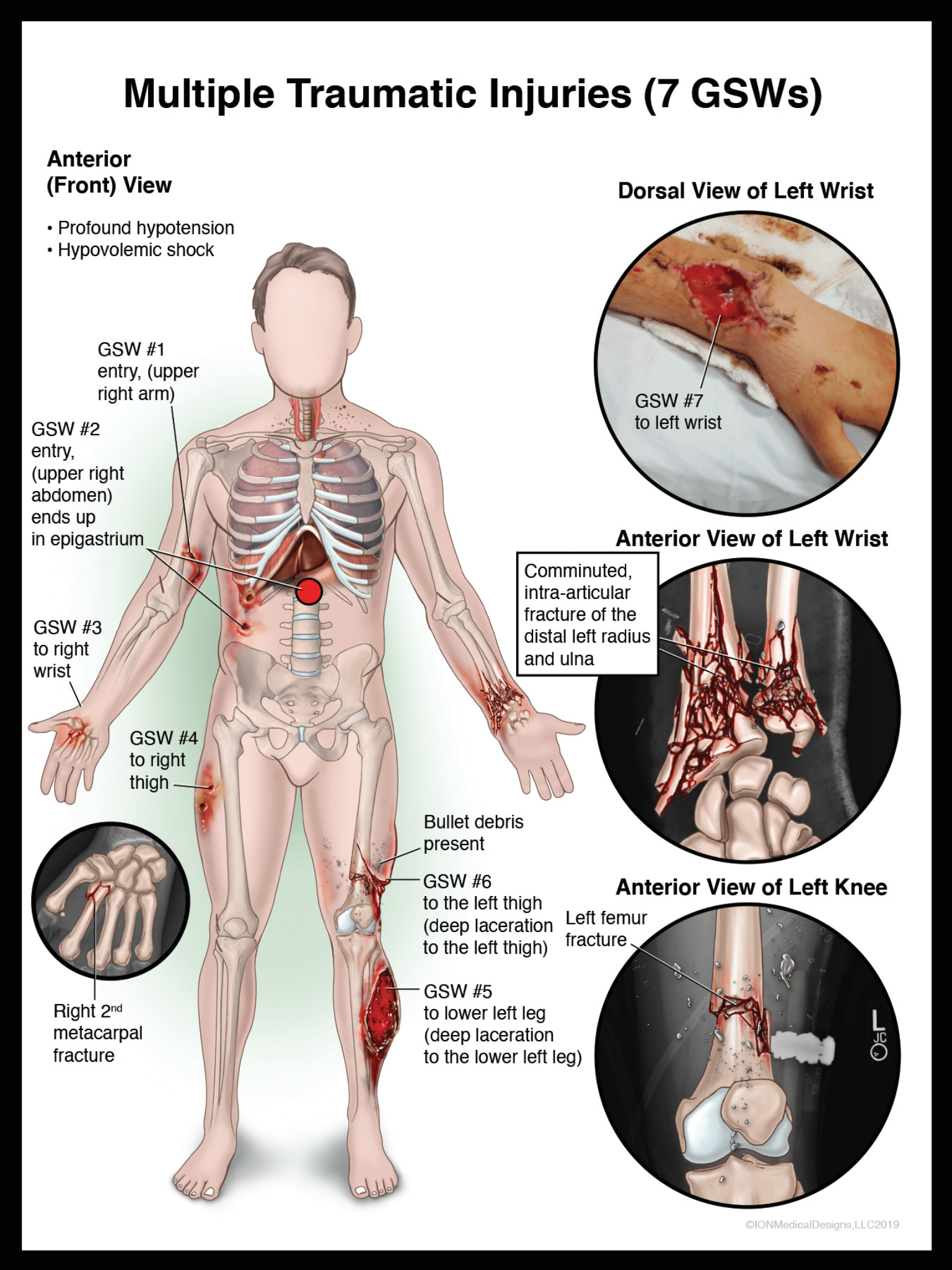 Fatal injury board, victim sustained multiple gunshot wounds. Illustration board depicts wound trajectory as well as organs traversed.
