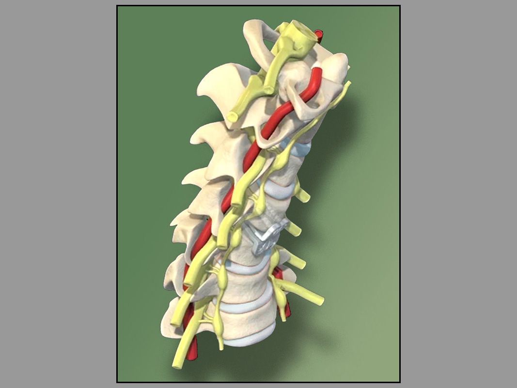 An animated sequence depicting the range of motion and integration of a Prestige Cervical disc to treat patients with herniated and/ or degenerated cervical intervertebral discs.